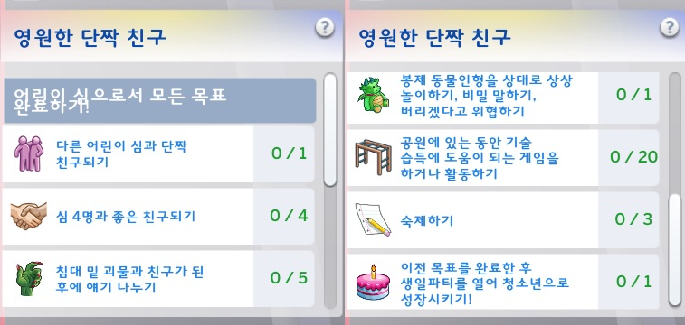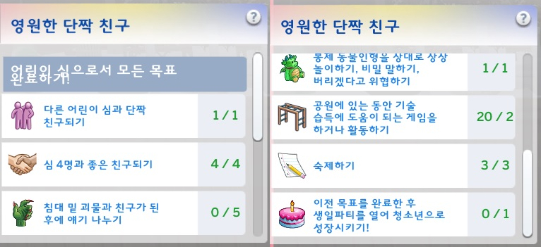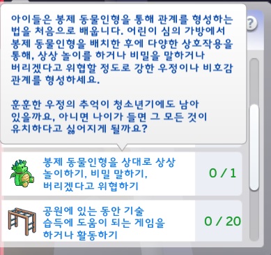 ~ 지난 이야기 ~ 영원한 단짝 친구 1 : https://simszieuuuun.tistory.com/2 침대 밑 괴물과 상호작용하는 미션 빼고 모든 미션을 완료한 상태,, 레몬이가 청소년이 되는 날은 점점 다가오는데 한 번도 나오