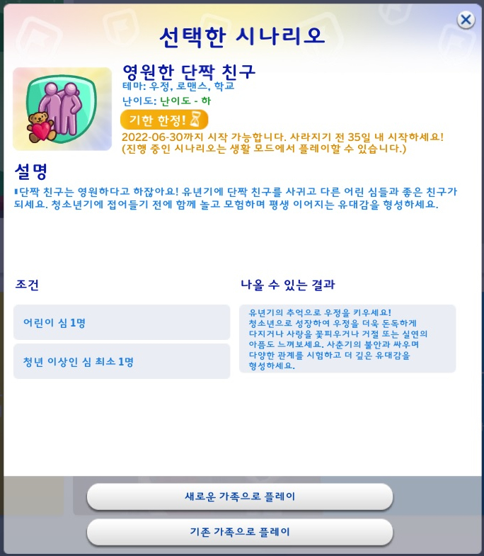 그 중 기한 한정 시나리오인 '영원한 단짝 친구'를 플레이해보았습니다.